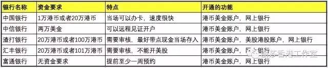 中國銀行,中信銀行,渣打銀行,匯豐(feng) 銀行,富邦銀行(沒有資金要求,隻限內(nei) 部預約)。其中中信銀行可以在國內(nei) 指定分行可以見證開戶,富通銀行對資金沒有要求,但是隻限內(nei) 部提前預約,具體(ti) 區別整體(ti) 如下: