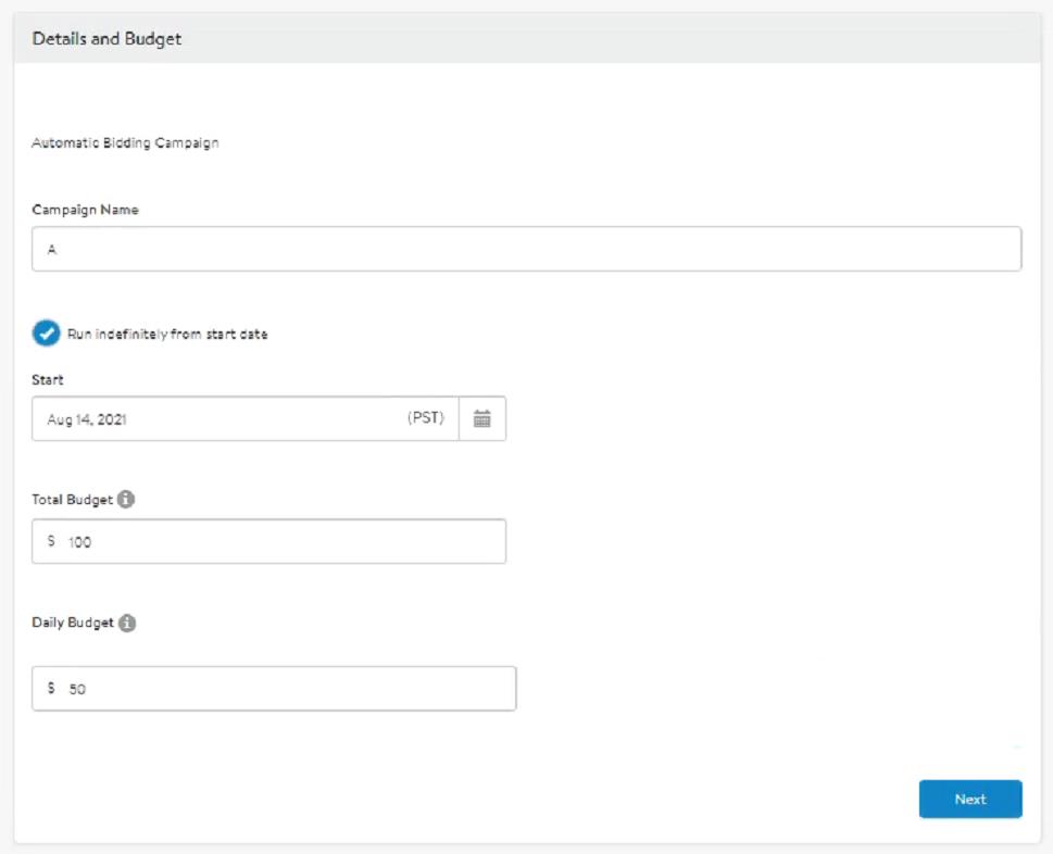 第 4 步:如圖4所示,輸入活動名稱並設置開始日期。你可以在此處選擇廣告的總預算以及每日預算。總預算必須至少為 100 美元,每日預算必須至少為 50 美元。