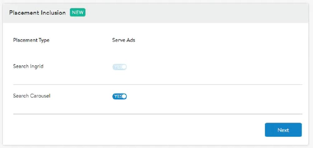 第 5 步(僅適用於手動廣告):如圖5所示,利用選擇展示位置包含的新功能,選擇稱為Search Ingrid和Search Carousel的兩種展示位置類型。Search Ingrid默認開啟,無法關閉。Search Carousel是可選的,但強烈建議擴大覆蓋麵,並且僅適用於基於關鍵字的廣告係列。此選項在搜索頁麵上的搜索輪播廣告中展示產品。