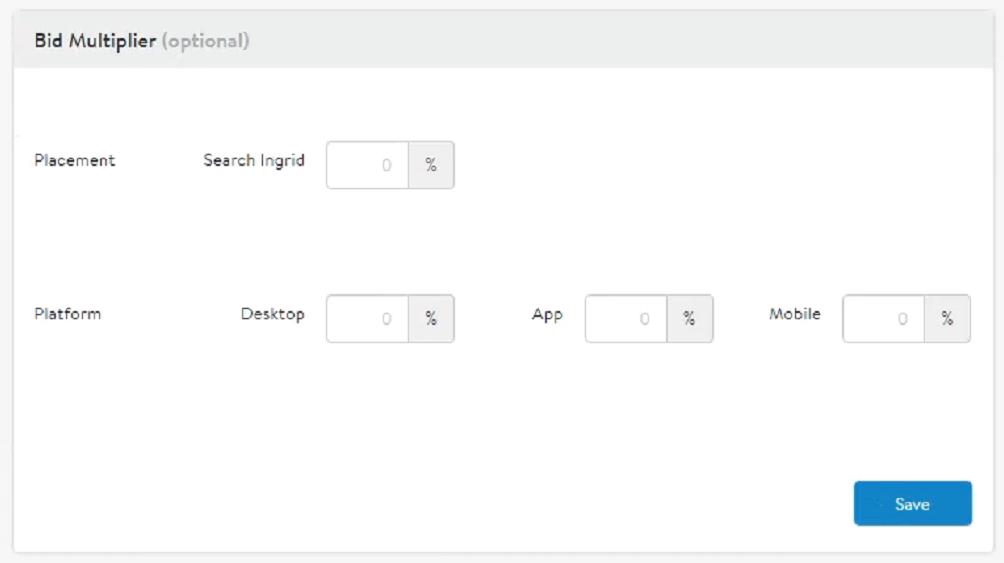 第 6 步:如圖6所示,選擇任何所需的Bid比率,這都是可選的,隻是讓你對廣告的展示位置進行控製。Bid比率是你願意提高出價(jia) 以顯示在某些Walmart廣告展示位置的百分比金額。