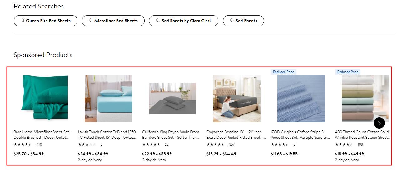 如圖10所示,讚助商廣告可以出現在 Walmart.com 的幾個不同位置。它們通常出現在搜索結果頁麵中,產品購買框下方,或者出現在搜索頁麵、產品頁麵上的產品輪播中。