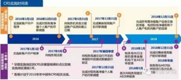 2017年1月1日,完成對新客戶開戶流程的改造,對於(yu) 2017年1月1日以後的新開戶客戶,可以通過盡職調查程序識別出其中的非居民賬戶。2017年12月31日前,完成對高淨值(在2016年12月31日金融賬戶加總餘(yu) 額大於(yu) 100萬(wan) 美金)存量個(ge) 人客戶的盡職調查程序,識別其中的非居民賬戶。2018年6月30日前(預計),完成向國稅總局的首次信息報送,並在以後年度每年定期向國稅總局進行信息報送。2018年9月30日前,中國將與(yu) 其他參與(yu) CRS 的轄區完成首次轄區間的信息交換,以後年度也將每年定期進行轄區間的信息交換。2018年12月31日前,完成對其餘(yu) 所有存量客戶的盡職調查程序,識別其中的非居民賬戶。